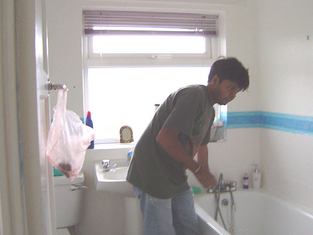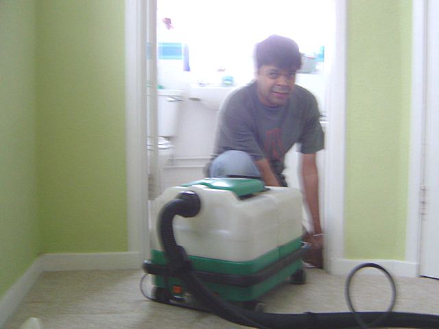 Alwyn cleans the bathroom carpet